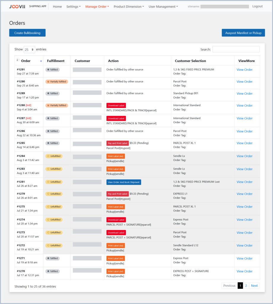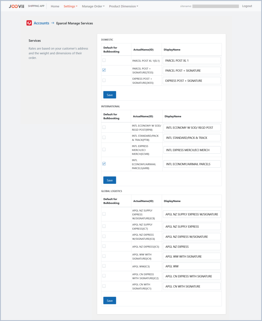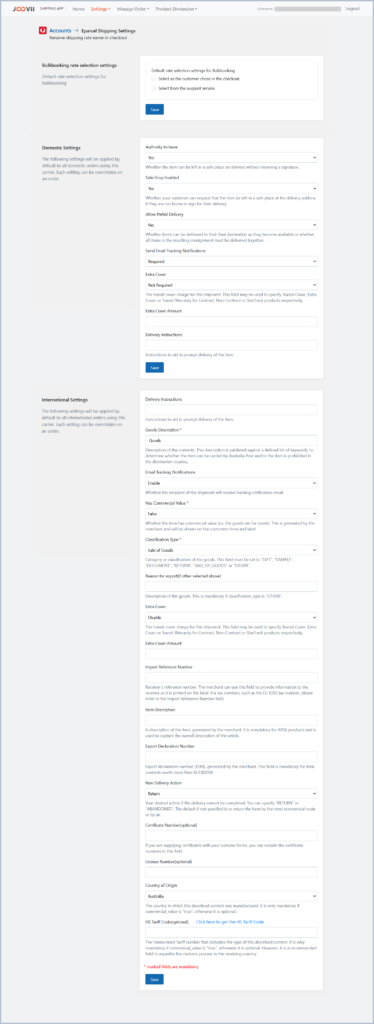 Settings : From settings merchant can add/edit Bulkbooking rate selection settings, domestic & International Settings. For Bulkbooking rate choose any one of this – 1.Select as the customer chose in the checkout or 2. Select from the auspost service. Also add/edit Domestic settings which will be applied by default to all domestic orders using this carrier. And for international settings will be applied by default to all international orders using this carrier. Each setting can be overridden on an order.