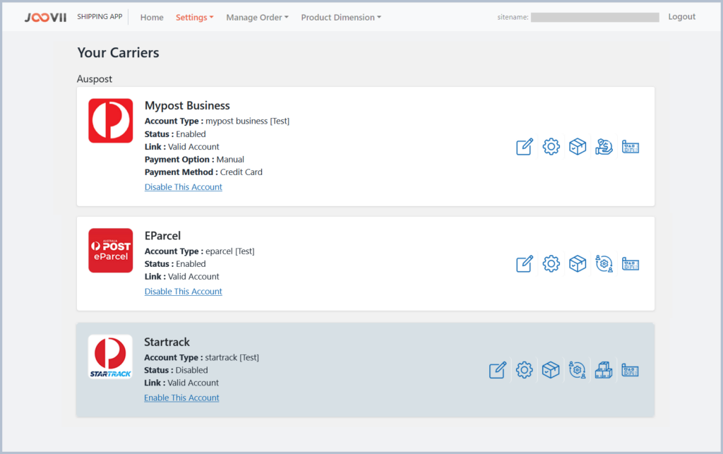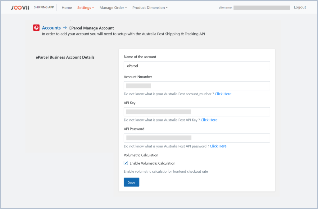 After configure eParcel Account From the settings page you can add/edit eparcel account details, update other settings like Bulkbooking rate selection settings, Domestic Settings & International Settings, add/edit package details, manage services & Generate label samples inside your eParcel Business portal.