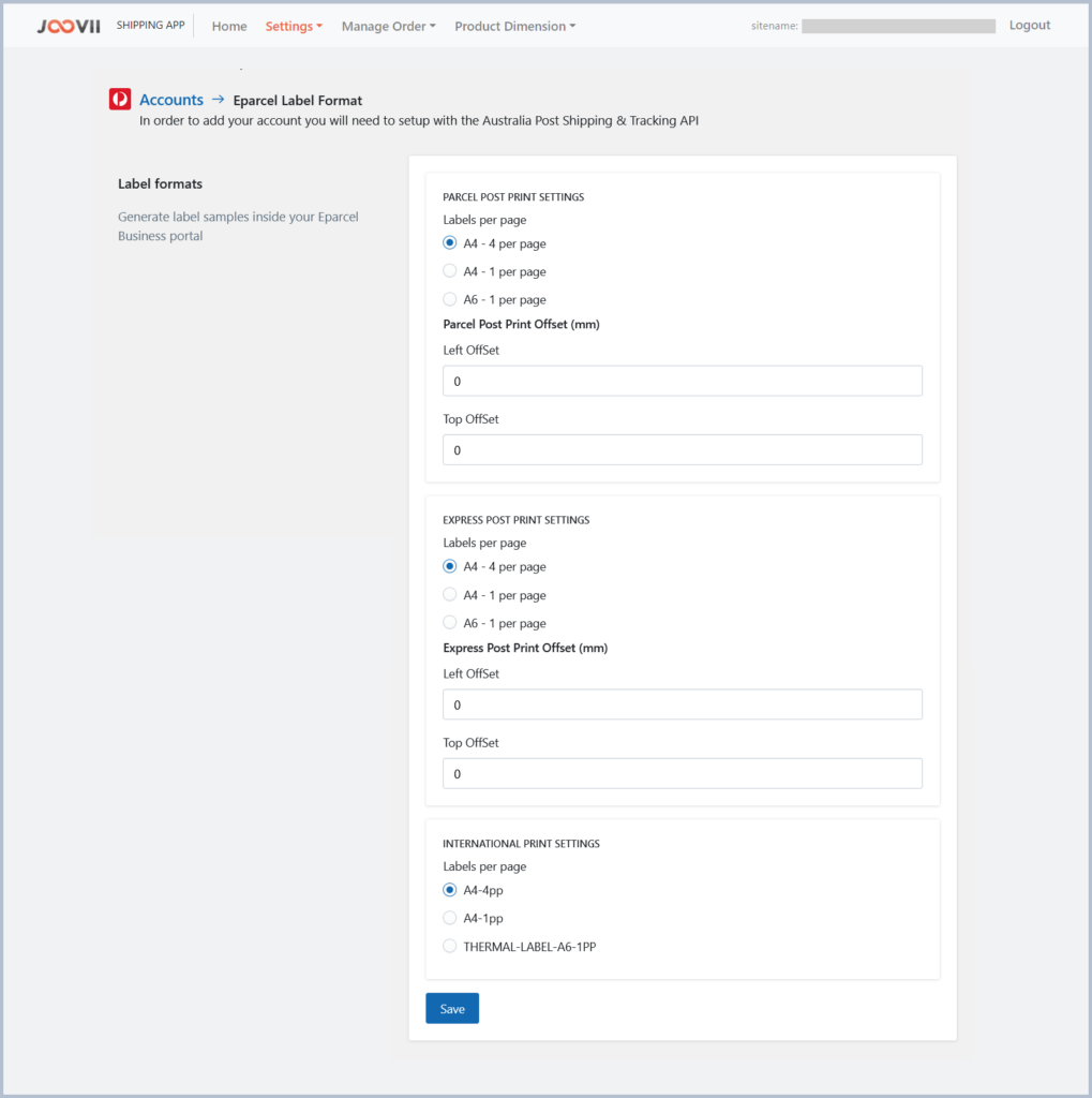 Eparcel Label Format: In order to add your account you will need to setup with the Australia Post Shipping & Tracking API & Generate label samples inside your Eparcel Business portal.
