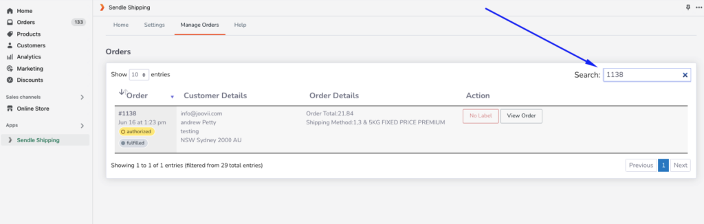 Type the order name in the top right search field in the order listing page of our app then you can see that order.