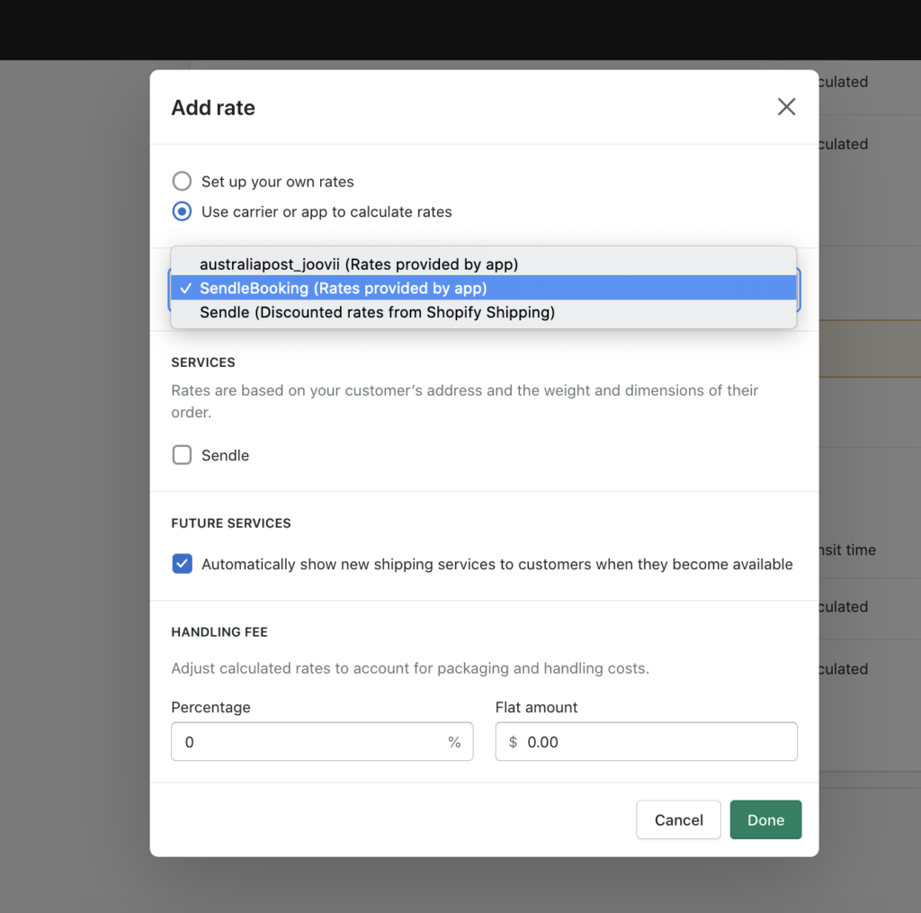 Select Add Rate and then “Use carrier or App to calculate rates” And from the drop down select Sendle Booking (Rates Provided by App). Also tick Sendle under services list.