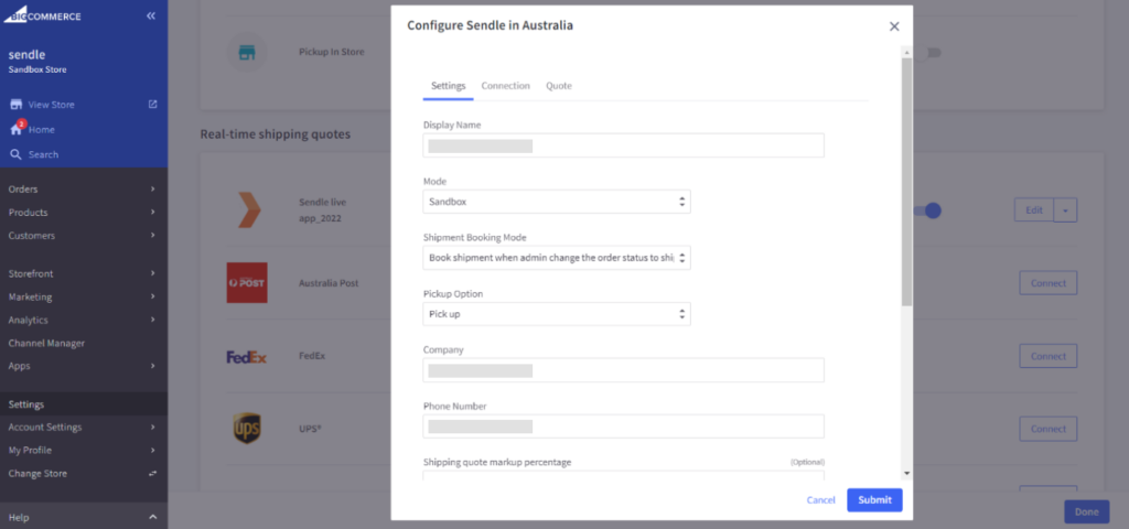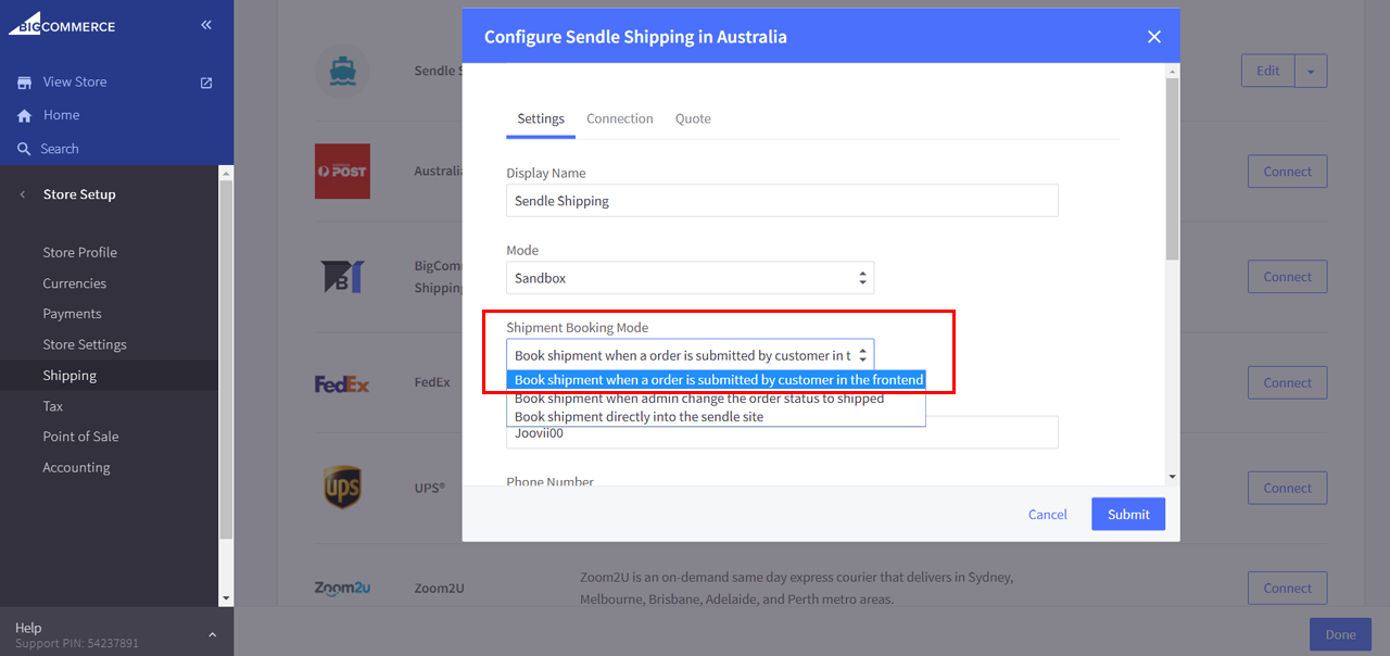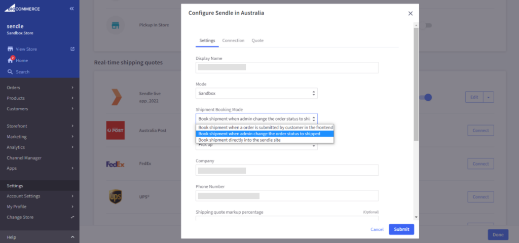Next step is to set the shipping preferences / settings. In this step you can set “Sendle Api Mode (sandbox/live)” and “Shipment Booking Mode”. .