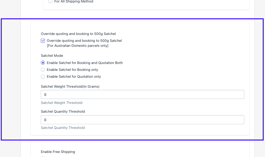 In Automatic booking the following can be set from the Settings page. Which allows booking and quoting to override the normal weight and dimension calculations and apply the Sendle Satchel. For quoting this means the customer would be quoted the price of sending the 500g satchel.
