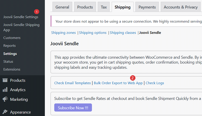 Such errors prevent Order synchronization between Joovii WP Sendle Plugin and Joovii Sendle WebAPP. ⦁ We have a third option to export bulk orders from WooCommerce Store to WebAPP. ⦁ Click on “Joovii Sendle Settings” on your left panel. ⦁ In the right Panel, click on “Bulk Order Export to Web App” link