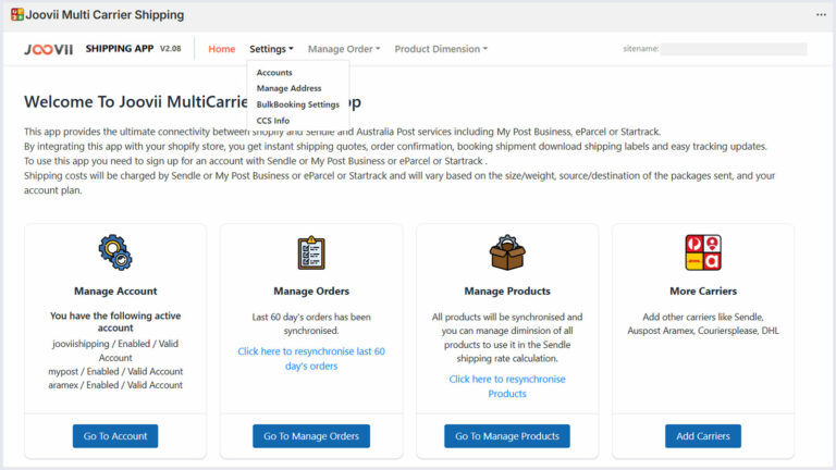 To enable Joovii Shipping go to Manage Accounts on the app home or Settings > Accounts in the app menu.